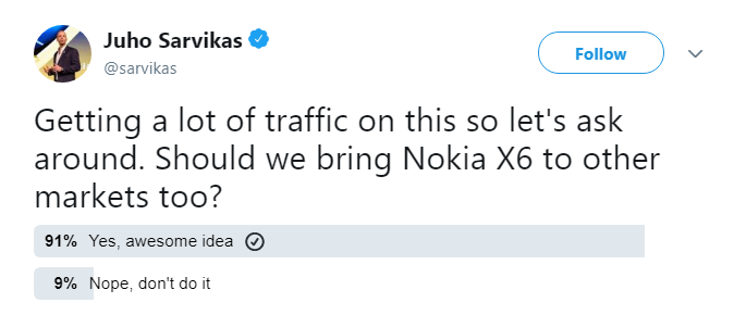Die Gerüchte relativieren sich allerdings angesichts der Tatsache, dass HMD Global Chief Product Officer Juho Sarvikas kürzlich eine Twitter-Umfrage dazu gestartet hat, ob das Nokia X6 auch für andere Märkte erscheinen soll. Zuletzt hatten starke 91 % dafür gestimmt. Somit erscheint die Ankündigung des X6 für die globalen Märkte am 29. Mai insgesamt stimmiger.