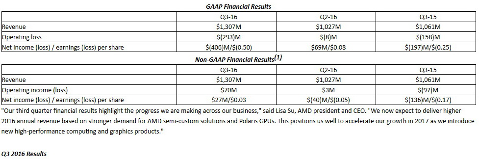 AMD kann aus dem Verkauf seiner neuen Polaris-GPU-Generation noch keinen Profit schlagen. Wie der US-amerikanische Chiphersteller gestern bekannt gab, konnte AMD den Umsatz im 3. Quartal 2016 auf 1,307 Milliarden US-Dollar steigern, nach 1,061 Milliarden in Q3/2015. Das entspricht einem Plus von 23,2 Prozent. Im Vorquartal Q2/2016 betrug der Umsatz 1,027 Mrd. US-Dollar.