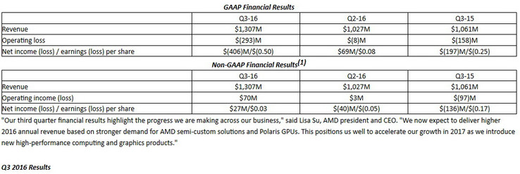 Nach einem kleinen operativen Verlust von 8 Millionen US-Dollar in Q2/2016 sowie 158 Mio. im 3. Quartal 2015 muss AMD für das abgelaufene Quartal des laufenden Geschäftsjahres 2016 allerdings wieder einen hohen operativen Verlust von 293 Millionen US-Dollar melden. Als Nettoverlust häufte AMD in Q3/2016 ein Minus von 406 Millionen US-Dollar an, nach einem kleinen Nettogewinn von 69 Mio. Dollar im 2. Quartals diesen Jahres.