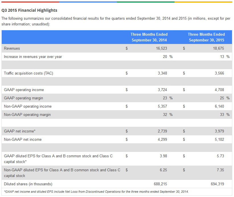 Für Google verkündete der Mutterkonzern Alphabet hervorragende Geschäftszahlen für das 3. Quartal 2015. Der Umsatz stieg gewaltig und zwar um 13 Prozent, von 16,523 auf nun 18,675 Milliarden US-Dollar. Zudem machte Google einen operativen Gewinn von 4,708 Milliarden Dollar, nach 3,348 Mrd. in Q3/2014. Der Nettogewinn schoss von 2,739 auf 3,979 Milliarden Dollar in die Höhe. Das entspricht einem Plus von 45,3 Prozent.