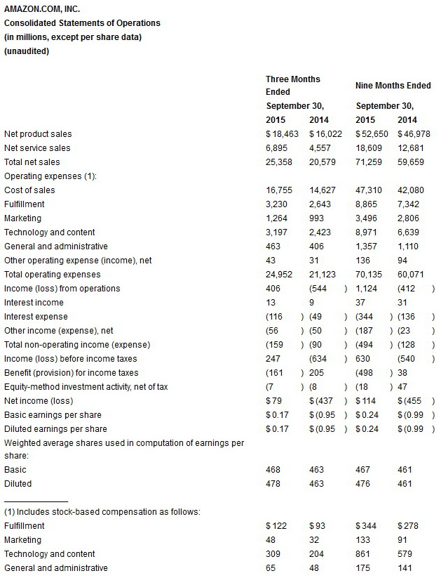 Amazon.com, Alphabet für Google und Microsoft gaben ihre aktuellen Geschäftszahlen für das jeweils abgelaufene Geschäftsquartal bekannt. Amazon freut sich für das 3. Quartal 2015 über ein Umsatzplus von 23,2 Prozent. Der Umsatz kletterte von 20,579 Milliarden US-Dollar auf 25,358 Mrd. und statt einem Verlust wies Amazon diesmal sogar einen kleinen Gewinn in Höhe von 79 Millionen aus.