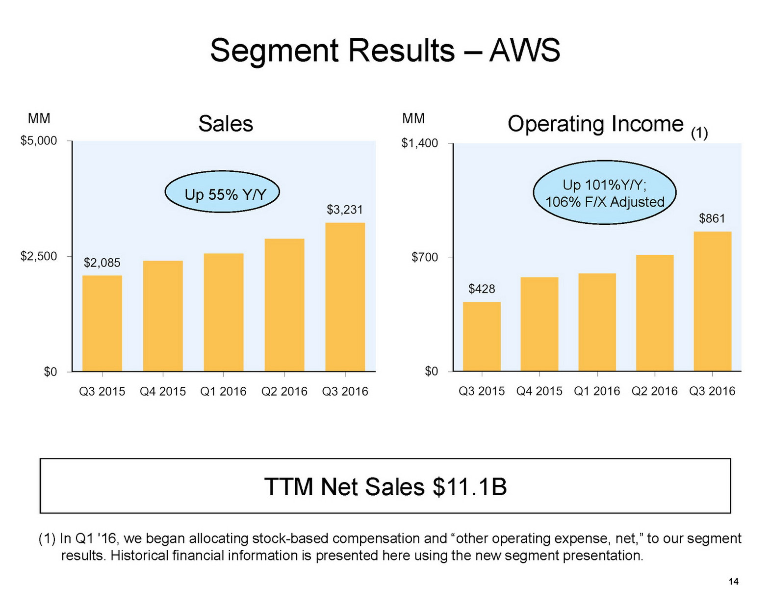 Als Nettogewinn kann Amazon.com für das 3. Quartal 2016 einen Reingewinn von 252 Millionen US-Dollar verbuchen, nach 79 Millionen in Q3/2015. Somit machte der Reinerlös des Onlineriesen im Vergleich zum Vorjahr einen gewaltigen Sprung nach oben. Unterstrichen wird der Gewinnsprung auch durch die Tatsache, dass Amazon für den 9-Monats-Zeitraum 2016 einen Nettogewinn von 1,622 Milliarden US-Dollar ausweisen kann. Im gleichen Zeitraum 2015 machte Amazon nur 114 Mio. Überschuss.
