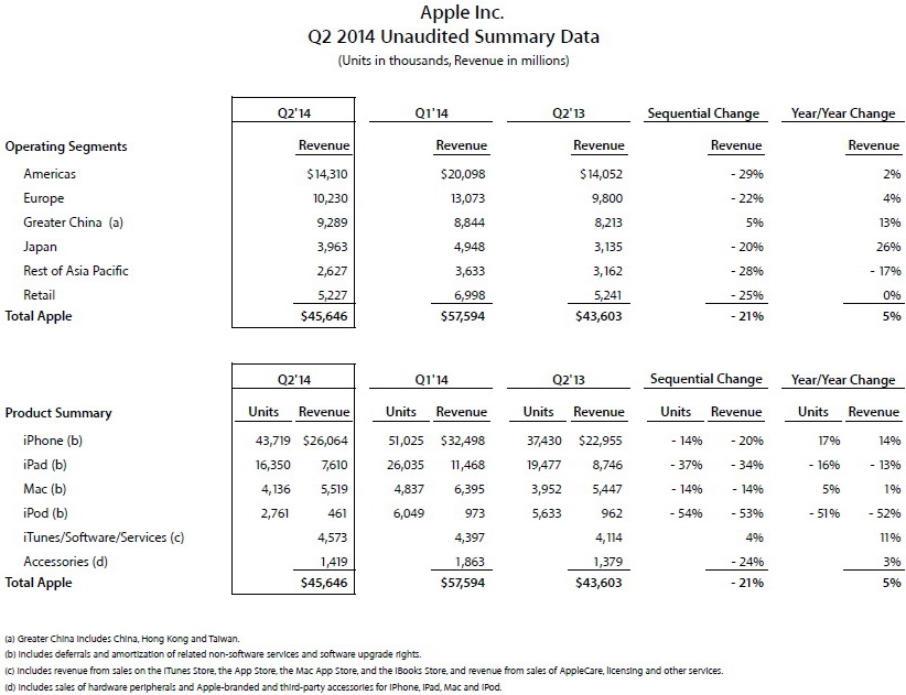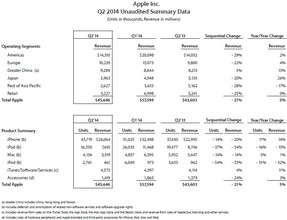 Bei Apple stieg im zweiten Quartal des Geschäftsjahrs 2014, welches am 29. März 2014 endete, der Umsatz auf 45,6 Milliarden US-Dollar sowie der Netto-Quartalsgewinn auf 10,2 Milliarden US-Dollar. Im Vorjahresquartal wurde ein Umsatz von 43,6 Milliarden US-Dollar sowie ein Netto-Gewinn von 9,5 Milliarden US-Dollar erzielt. Die Bruttogewinnspanne lag bei 39,3 Prozent, verglichen mit 37,5 Prozent im Vorjahresquartal. Der Nicht-US-Anteil am Umsatz betrug in diesem Quartal 66 Prozent.
