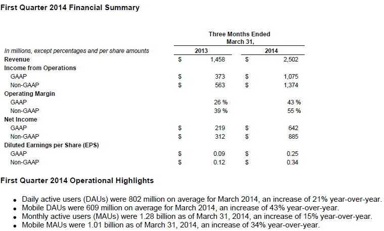 Facebook: FQ1/2014: http://investor.fb.com/releasedetail.cfm?ReleaseID=842071