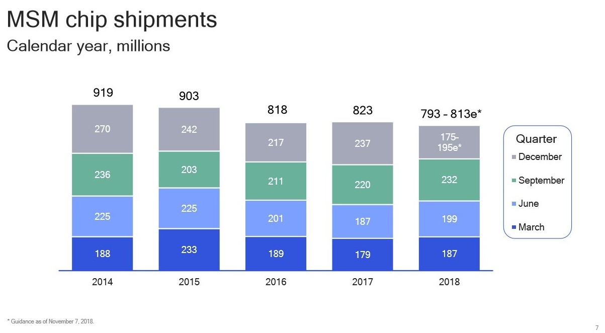 Allerdings konnte Qualcomm seinen Absatz von Smartphone-MSM-Chips wie der Snapdragon-Serie im September 2018, im Vergleich zum gleichen Monat des Vorjahres, von 220 auf 232 Millionen Einheiten steigern. Auf das Gesamtfiskaljahr bezogen machte Qualcomm mit der Sparte QCT (Qualcomm CDMA Technologies) einen Umsatz von 17,28 Mrd. Dollar (FY17: 16,48 Mrd. US-$). Die Einnahmen aus dem Lizenzgeschäft (QTL) sind hingegen von 6,44 Mrd. auf 5,16 Mrd. Dollar gesunken.