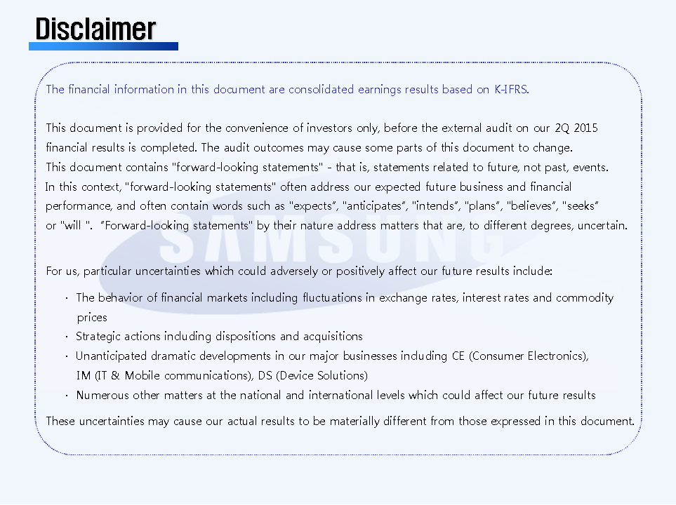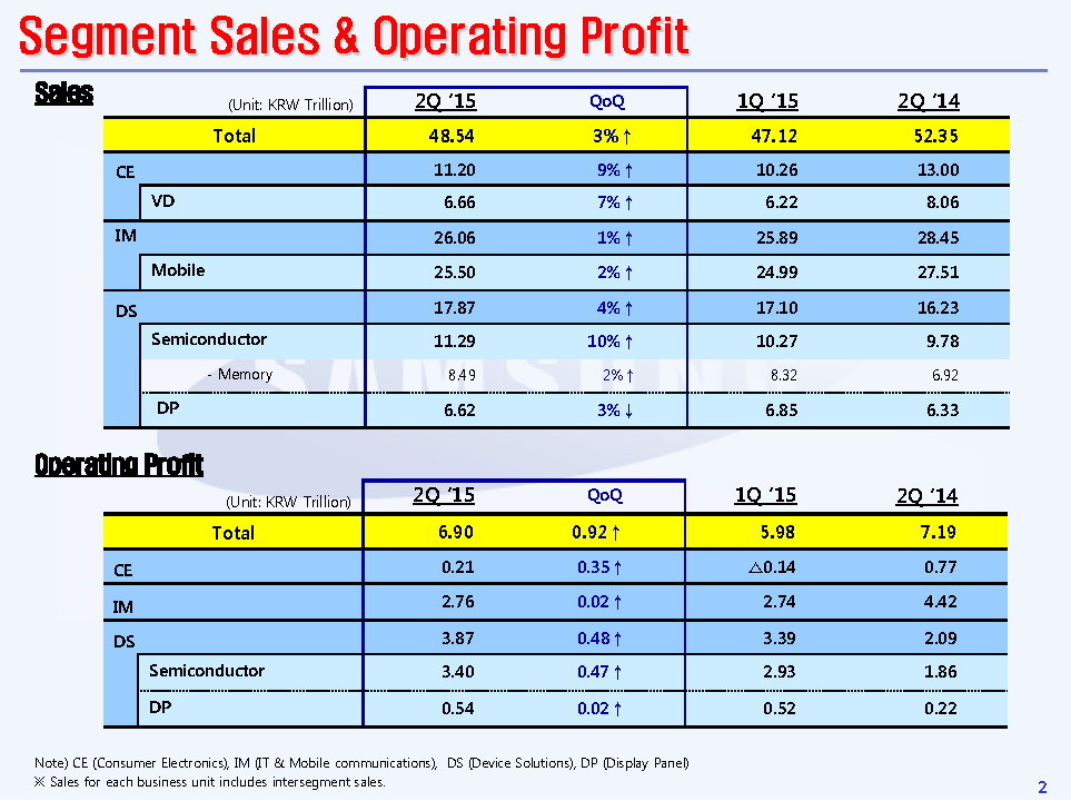 Samsung meldet für das 2. Quartal 2015 einen Nettogewin von 5,75 Billionen KRW (4,49 Mrd. Euro). Im Vergleichsquartal des Vorjahres (Q2/2014) lag dieser noch bei 6,25 Billionen. Damit machte der Branchenriesen um 8 Prozent weniger Gewinn. Der Umsatz von Samsung fiel im Vergleich zu den 52,35 Billionen Won aus Q2/2014 um 7,28 Prozent auf 48,54 Billionen Won (37,9 Mrd. Euro).