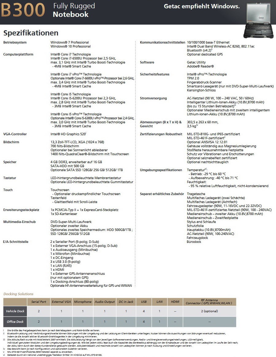 Von dem Upgrade verspricht sich Getac vor allem eine höhere Rechenleistung und Effizienz. Als IGP arbeitet im Getac B300 mit Skylake-CPUs dann ab sofort jeweils eine Intel HD Graphics 520 (GT2). Kabellos kommunizieren kann das aktualisierte Getac B300 beispielsweise über WLAN 802.11ac und Bluetooth 4.2. Auch der Schutz gegen Fremdzugriffe wurde noch einmal verstärkt.