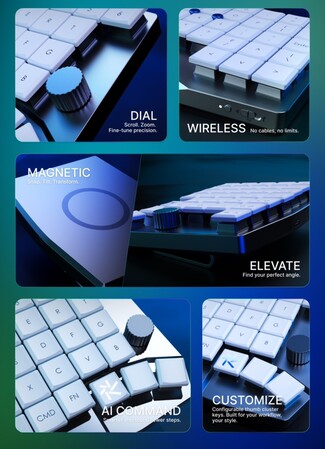 Das Uniboard Zero besitzt einen dedizierten AI-Button sowie drei Tasten, die bequem mit dem Daumen erreicht werden können – die Funktion dieser Daumen-Tasten kann frei angepasst werden. Der Drehregler auf der linken Hälfte der Tastatur kann das Mausrad ersetzen, um durch Webseiten zu scrollen, oder aber durch Apps zoomen oder die Größe eines Photoshop-Pinsels anpassen. Ein verstellbarer Standfuß erlaubt es, den Winkel der Tastatur frei anzupassen. Das kompakte QWERTY-Layout der Tastatur verzichtet auf Funktionstasten, bietet aber immerhin normalgroße Pfeiltasten.
