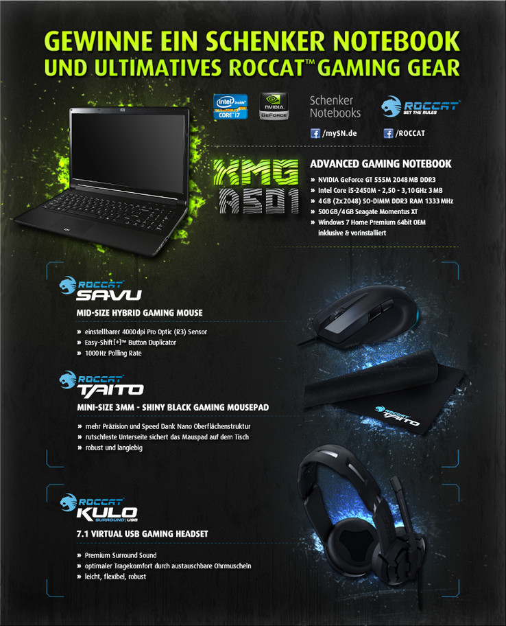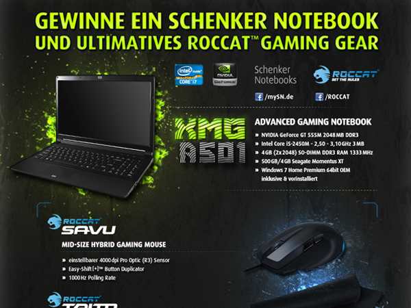 Unsere Kooperationspartner bei diesem Gewinnspiel sind das Leipziger Unternehmen Schenker Notebooks und der Peripherie-Hersteller Roccat, die zusammen Preise im Gesamtwert von zirka 1000 Euro zur Verfügung stellen.