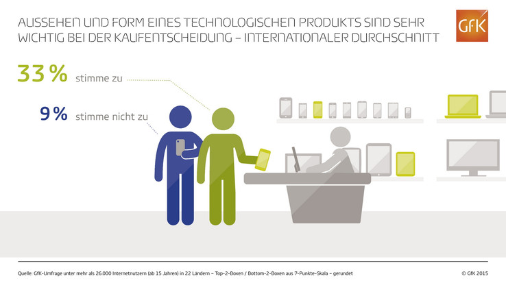 GfK fragte mehr als 26000 Internetnutzer in 22 Ländern, wie sehr sie der Aussage "Aussehen und Form eines technologischen Produkts sind sehr wichtig bei der Kaufentscheidung" zustimmen. Für 33 % aller Befragten sind der Look & Style eines Technikprodukts wichtig. Nur 9 Prozent sehen das anders und sind nicht dieser Meinung.