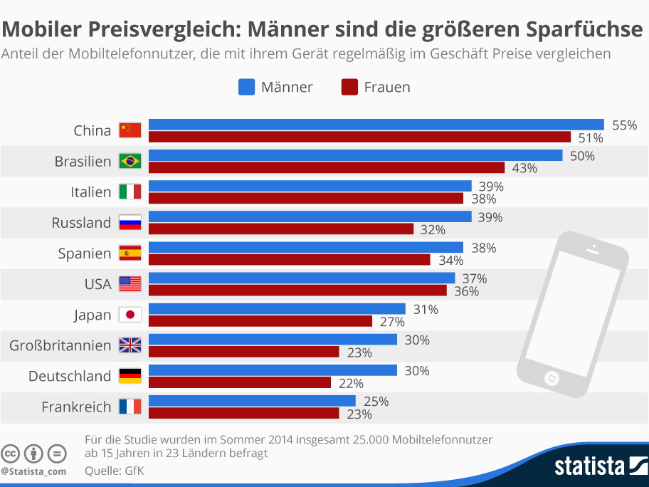 Gemäß der GfK-Studie nutzen weltweit mittlerweile 40 Prozent aller Konsumenten ihr Mobiltelefon im Geschäft, um Preise zu vergleichen. Ebenfalls 40 Prozent holen sich deswegen Rat von Freunden oder der Familie. Und über ein Drittel macht Fotos vom gewünschten Produkt. Auch in Deutschland wird das Phone als Shopping-Tool genutzt: Jeweils etwa ein Viertel nutzt ihr Mobiltelefon im Geschäft regelmäßig, um Preise zu vergleichen, Fotos vom Produkt zu machen oder Freunde und Familie um Rat zu fragen.