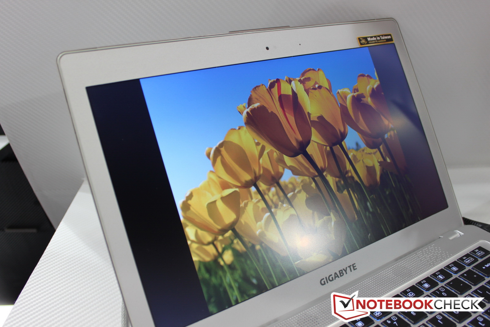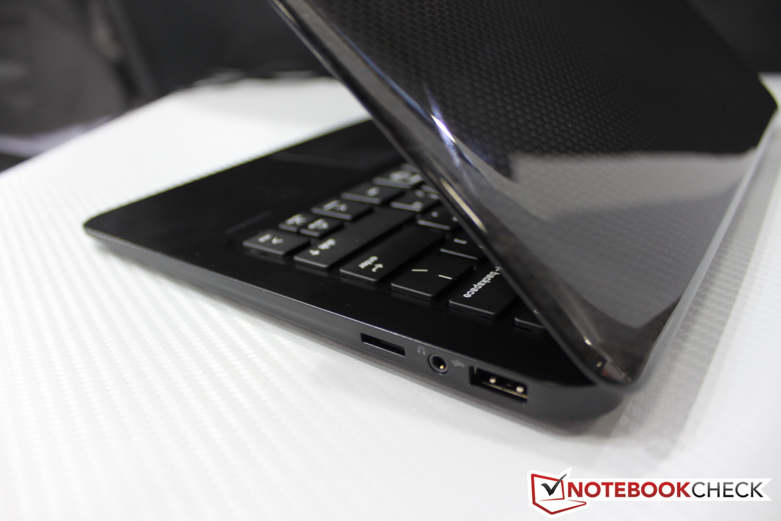 Die technischen Daten zum Gigabyte X11 Carbonbook haben wir bereits in einer News genannt. Daher hier lediglich noch ein paar persönliche Eindrücke vom Gigabyte X11 vor Ort auf der Messe: Das Gehäuse ist tatsächlich komplett aus einem Kohlefaser-Verbundstoff gefertigt und mit rund 975 Gramm nicht nur auf dem Papier superleicht. Eine Hand reicht für den schicken Carbon-Zwerg locker aus.