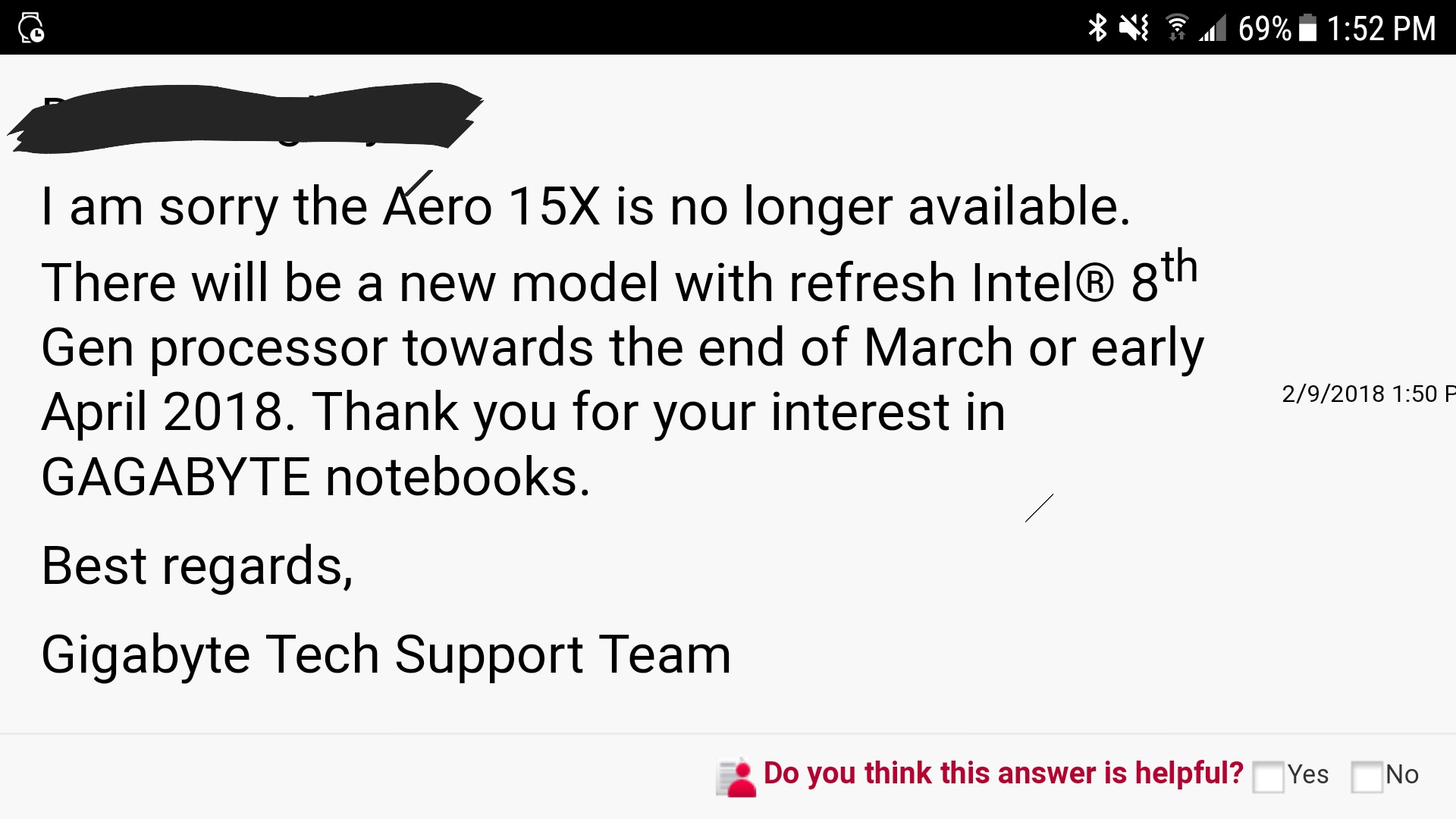 Jetzt kursiert eine angebliche Antwort des Supports von Gigabyte, in welcher der Hardware-Hersteller das Aero 15X in der bisherigen Form mit Intel Core i7-7700HQ abkündigt. Das Aero 15X sei nicht mehr länger verfügbar, da es gegen Ende März bis Anfang April 2018 neue Modelle als Nachfolger geben werde, die dann mit Coffee-Lake-H-Prozessoren von Intel ausgerüstet sind.