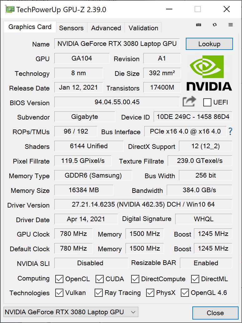 | 87.6 % v7 (old) | 01 / 2021 | Gigabyte Aero 17 HDR YC i9-10980HK, GeForce RTX 3080 Laptop GPU | 2.8 kg | 21.4 mm | 17.30" | 3840x2160 | |