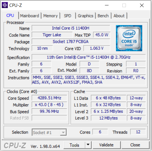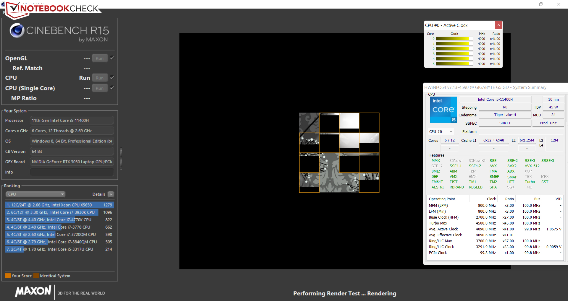 Der Core-i7-11400H-Sechskernprozessor (Tiger Lake) erreicht Taktraten von 4,1 GHz (sechs Kerne) bis 4,5 GHz (ein Kern). Hyperthreading (zwei Threads pro Kern) wird unterstützt. Die CPU-Tests des CB-R15-Benchmarks werden mit 4,1 GHz (Multi) bzw. 4,1 bis 4,5 GHz (Single) durchlaufen. Im Akkubetrieb liegen die Taktraten bei 1,9 bis 2 GHz (Multi) bzw. 3,1 bis 4,5 GHz (Single).