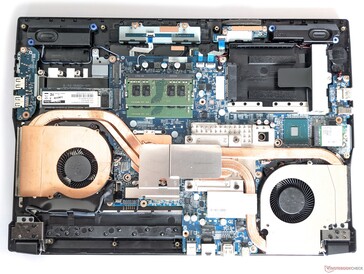 Neben dem ohne Werkzeug austauschbarem Akku kann beim Gigabyte G5 auch die Tastatur gewechselt werden, sollte dies einmal nötig sein. Werden die zahlreichen Schrauben an der Unterseite entfernt, sind im Inneren außerdem zwei RAM-Bänke, zwei SSD-Slots und ein freier 2,5-Zoll-Laufwerksschacht zu erreichen. Auch das WLAN-Modul kann auf diesem Weg getauscht werden.