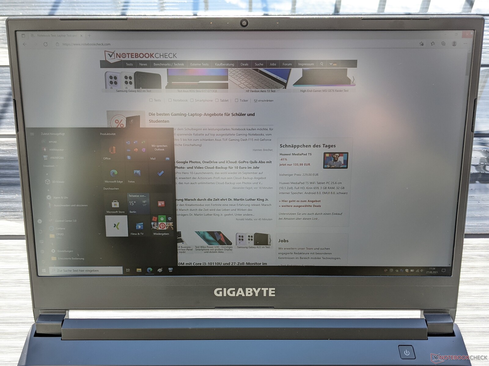 Der Bildschirm des Gigabyte G5 KC besteht aus einem 15,6 Zoll großen IPS-Panel und bietet eine Auflösung von 1.920 x 1.080 Bildpunkten sowie eine Bildwiederholrate von 165 Hz. Die durchschnittliche maximale Helligkeit ist mit 275 cd/m² die höchste in unserem Testfeld. Die Ausleuchtung ist mit 86 Prozent hingegen durchschnittlich.