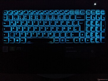 Gigabyte verbaut außerdem eine Tastenbeleuchtung, die für eine gleichmäßige Ausleuchtung der Beschriftung sorgt. Farben lassen sich aber nicht frei einstellen, sonden nur aus einer vorgegebenen Palette wählen, wodurch beispielsweise keine weiße Beleuchtung eingestellt werden kann.