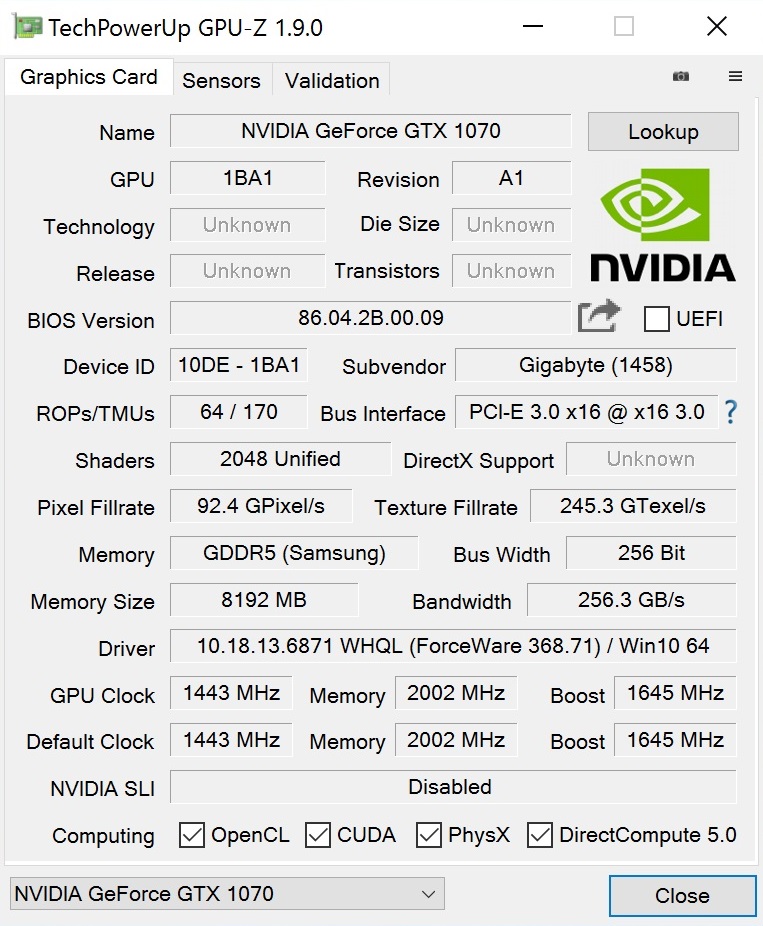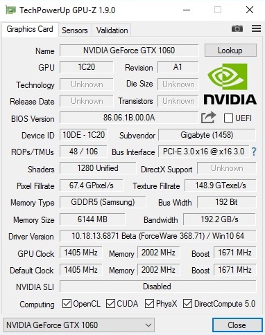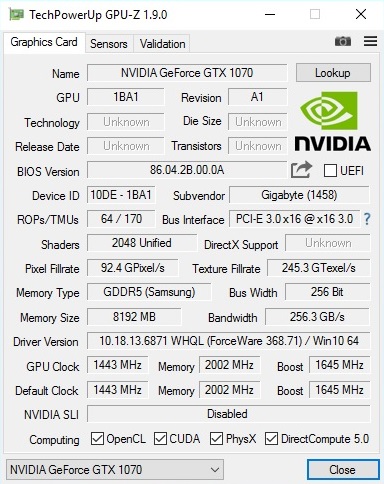 Im Bezug auf die Taktraten verhält sich das P55W v6 fast genauso wie das konkurrierende Clevo-Barebone P651RP6-G. Der Unigine Heaven Benchmark gab beim Kern im Schnitt 1.600 MHz aus (1.570 MHz @Schenker XMG P507). Obwohl Nvidia als Turbo-Rahmen 1.405 bis 1.671 MHz nennt, werden theoretisch bis zu 1.900 MHz erreicht (Render-Test des Tools GPU-Z). Gleiches gilt auch für die GeForce GTX 1070, bei der Nvidia 1.443 bis 1.645 MHz angibt.