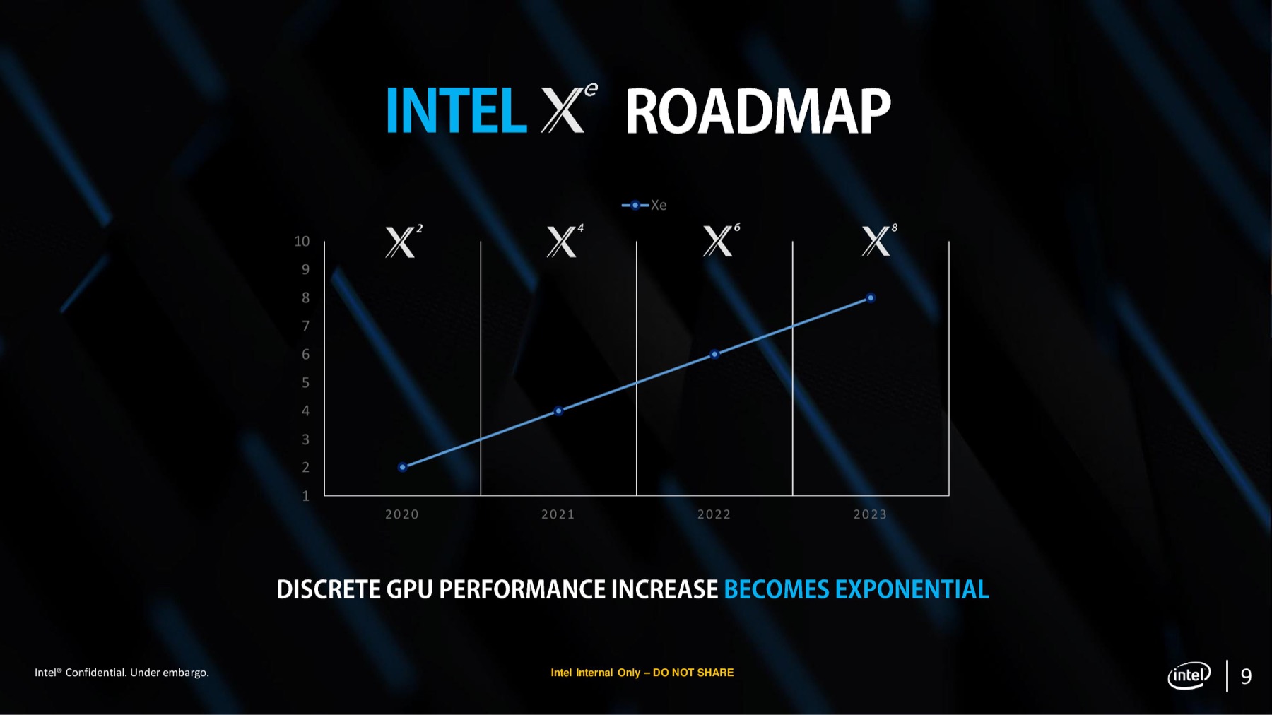 In der internen Präsentation spricht Intel davon, dass auf drei Gebieten Fortschritte erzielt werden müssen: Beim Fertigungsprozess, bei der Mikroarchitektur und beim "e". Erstere Gebiete werden bereits von der Konkurrenz seit Jahre optimiert, das "e" hingegen wurde schon lange vernachlässigt. "e" steht dabei für die Anzahl der simultan verwendeten GPUs, und ist ein derart integraler Bestandteil in Intels Plänen, dass die Grafikkarten mit "Xe" danach benannt wurden.
