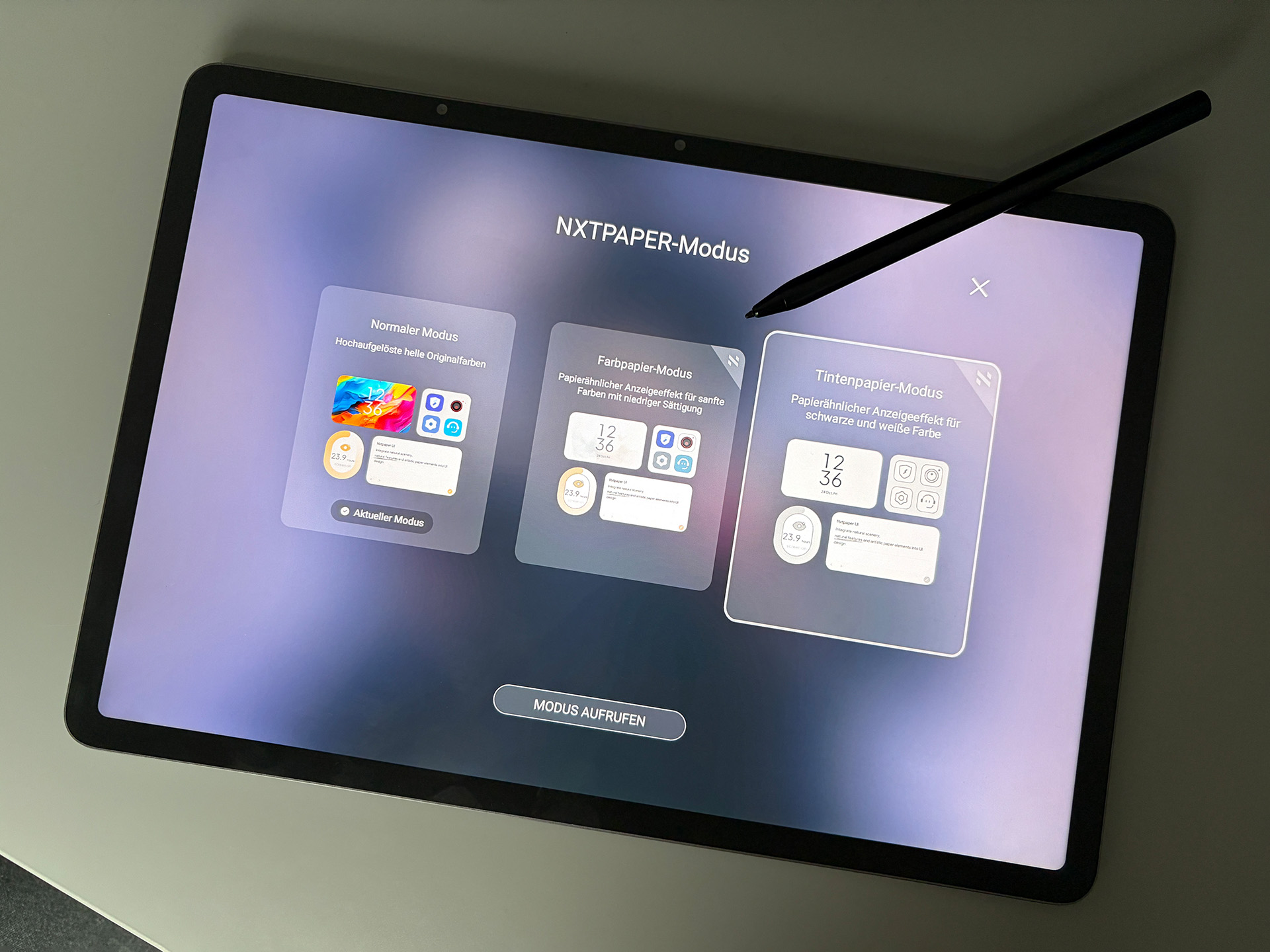 Über eine dedizierte Taste lässt sich der Bildschirmmodus wechseln. Neben den normalen Modus ist auch ein Farbpapiermodus vorhanden, welcher farbiges Papier simulieren soll und eine wesentlich wärmere Darstellung mit geringerer Sättigung sowie sanften Farben besitzt. Der dritte Modus nennt sich Tintenpapier-Modus und beschränkt sich auf eine monochrome Darstellung, ähnlich wie bei einem eBook-Reader. Ein echtes eInk-Display ist aber nicht verbaut und auch bei der Darstellung der Farben hätten wir uns eine bessere Kalibrierung gewünscht.