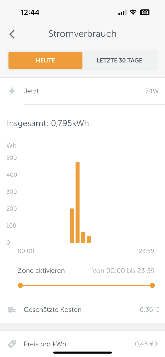 Die Erfassung funktioniert also ziemlich gut und eignet sich dazu, entstehende Kosten zu ermitteln, denn es lässt sich auch ein Preis pro Kilowattstunde eintragen und die Steckdose schätzt daraus die entstandenen Kosten. Leider ist der Zeitraum auf die letzten 30 Tage beschränkt und es gibt Abseits eines Screenshots keine Möglichkeit, die aufgezeichneten Daten zu exportieren.