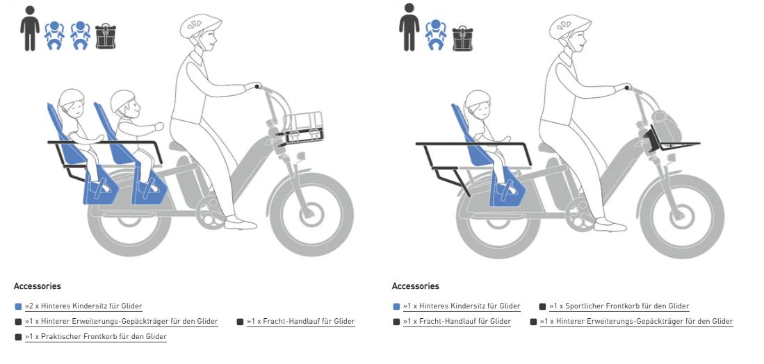 Cyrusher hat im eigenen Online-Shop mit dem Glider ein weiteres Fahrrad mit Elektromotor im Angebot. Das Glider ist dabei als Lastenfahrrad geführt und dürfte sich dementsprechend auch für den Transport größerer Lasten gut eignen. Im Prinzip handelt es sich um ein Longtail, allerdings dann doch der insgesamt eher kürzeren Bauart - zumindest ist der Gepäckträger nicht extrem lang. Auf dem Gepäckträger lässt sich aber nicht nur Gepäck mitnehmen, mithilfe einer entsprechenden Haltestange oder auch eines Sitzes ist die Mitnahme von Kindern denkbar, Herstellerangaben zufolge ist die Mitnahme von zwei Kindern möglich - solange diese beide nicht zu groß sind. Gepäck und Personen lassen sich zumindest in Maßen gleichzeitig transportieren, da auch die Montage eines Frontgepäckträgers möglich ist.