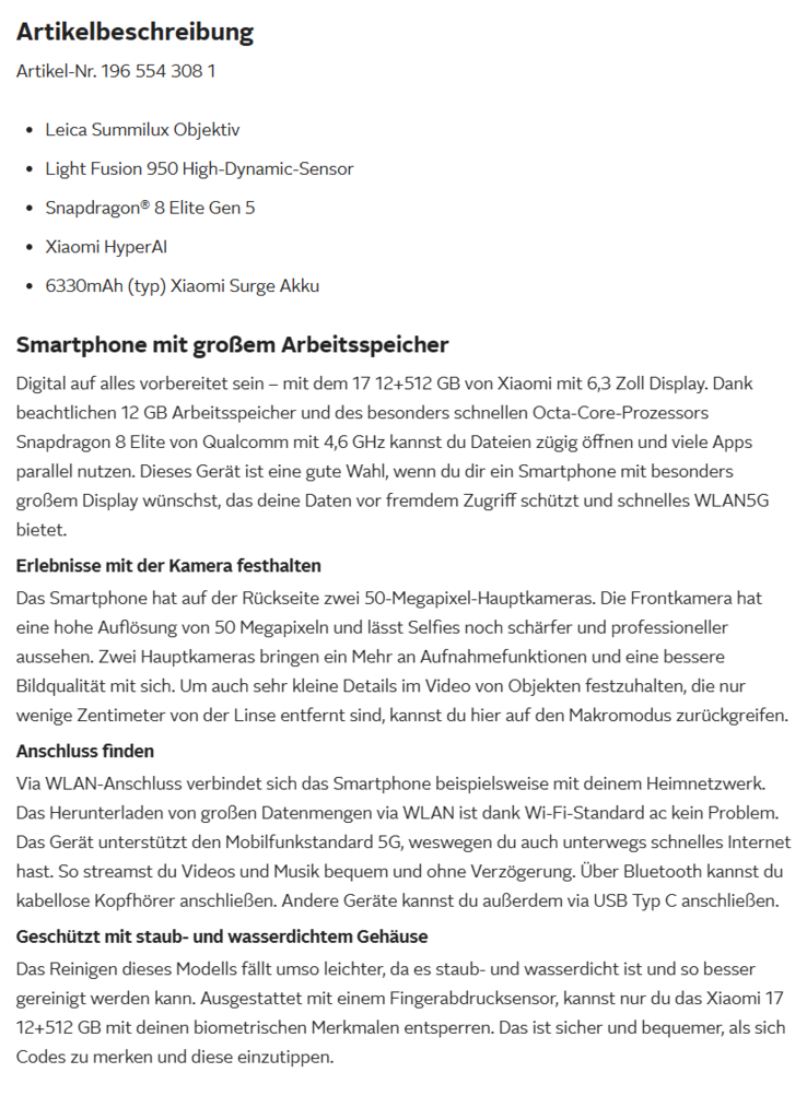Unverhofft kommt oft. So etwa beim Stöbern im Onlineshop eines bekannten deutschen Händlers, den wir hier absichtlich nicht nennen wollen. Da tauchte doch plötzlich bereits das noch nicht in Europa verfügbar Xiaomi 17 im Laden auf, mitsamt Europreis, globalem Renderbild und weiteren Informationen, die ein aufmerksamer Leser (Danke, Wolfgang!) geistesgegenwärtig mit Screenshots verewigt hat. Kurze Zeit später war der Spuk vorbei, bekannt ist nun allerdings, dass das 6,3 Zoll große Xiaomi 17 in Deutschland mit 12 GB RAM und 512 GB Speicher um 1.099, 90 Euro auf den Markt kommen wird.