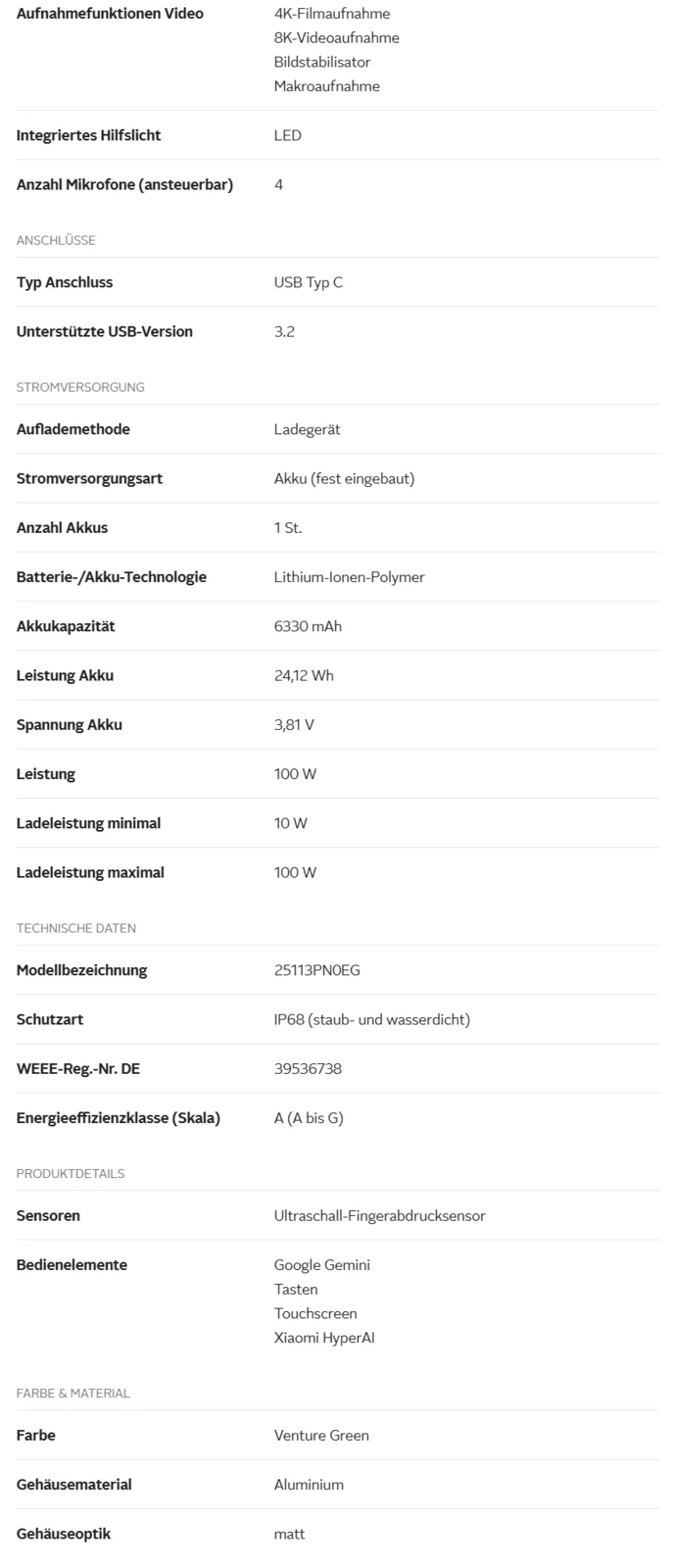 Die Specs des Xiaomi 17 dürften ja bereits durch den China-Launch beziehungsweise unseren Testbericht bekannt sein. Einige Highlights nennt auch das globale Renderbild von Xiaomi, etwa den Snapdragon 8 Elite Gen 5, das dynamische 6,3 Zoll Display mit 1 Hz bis 120 Hz Refreshrate sowie das Leica Summilux Objektiv. Wie bereits vorab durch Leaks enthüllt wurde, bietet der Akku im globalen Modell 6.330 mAh, das ist weniger als die 7.000 mAh der China-Variante. Der Akku lädt mit bis zu 100 Watt über ein USB-PD Netzteil, lieferbar ist das Xiaomi 17 laut Händler in drei Wochen. Das dürfte allerdings nicht ab jetzt gelten sondern ab dem offiziellen Launchdatum, wenn auch die Händlerseite regulär zugänglich sein wird. Sofern das Xiaomi 17 also zum Start des Mobile World Congress am 1. März gelauncht wird, ist wohl mit einer Verfügbarkeit ab dem 23. März auszugehen. Wir haben übrigens überprüft, ob die Produktseite beim Händler noch online ist und im Internet-Archiv zu finden ist. Beides ist nicht der Fall, bei Google ist aber mittlerweile ein neuer Leak zu finden, der explizit die grüne Farboption betrifft: