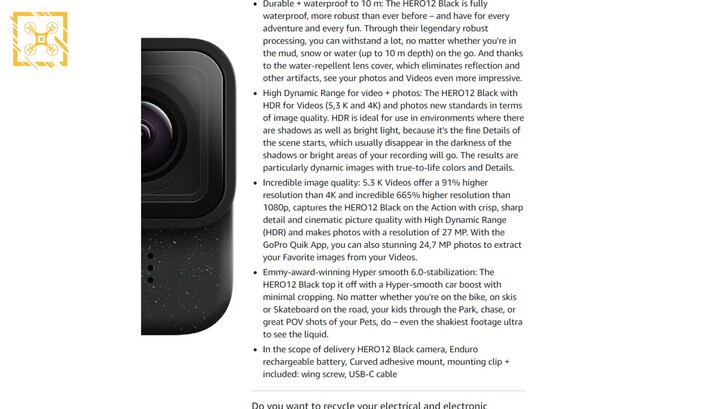 In den nun von @quadro_news geleakten Teilen eines Datenblatts und Feature-Auszugs der GoPro Hero 12 Black (die übrigens so aussehen als stammten sie aus einem Amazon-Leak) finden sich dagegen ganz klar eindeutige Hinweise auf die HDR-Unterstützung von Videoaufnahmen. Es stimmt also, dass GoPro offenbar weder bei den Video-Modi, am Digitalzoom oder dem Bildsensor Neues zu bieten hat, die Qualität des Videomaterials in schwierigen Lichtsituationen mit hoher Dynamik könnte allerdings dennoch besser ausfallen als bei der GoPro Hero 11 Black.
