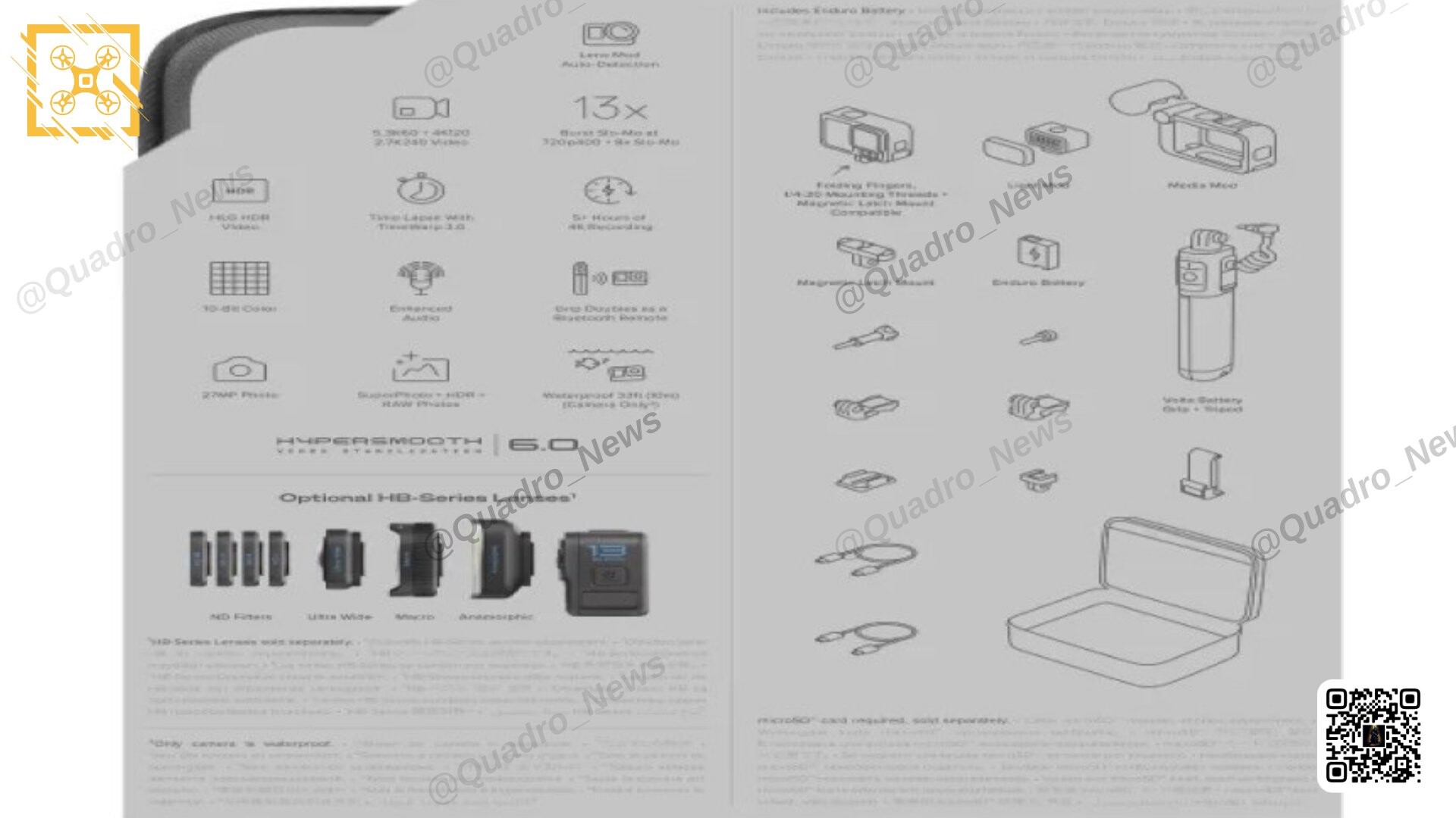 Die Bilder der Verpackung oben sind leider nicht hochauflösend genug um alle Inhalte komplett zu erkennen, einige Specs lassen sich aber dennoch daraus ableiten. Demnach wird sich im Vergleich zum Vorgänger vergleichsweise wenig an den Specs der neuen Actioncam ändern. Es bleibt offenbar beim 27 Megapixel Sensor, der weiterhin nur 5K-Aufnahmen bei maximal 60 fps erstellen kann, von einigen vielleicht erwartete 8K-Aufnahmen ist keine Rede. Bei 4K sollen 120 fps drin sein. Sowohl bei den HDR-Features als auch bei GoPros Stabilisierungstechnologie HyperSmooth 6.0 sind offenbar keine Verbesserungen zu erwarten, auch ein 1-Zoll Sensor scheint nicht an Bord zu sein.