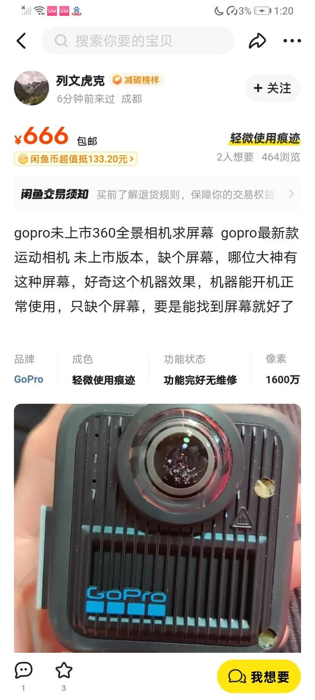Auch DJI wird am 31. Juli die erste 360-Grad-Kamera aus eigenem Haus vorstellen, während Insta360 im Gegenzug mit Antigravity-Drohnen abheben wird, die ihrerseits vermutlich 360-Grad-Kameras an Bord haben werden. Aber zurück zu GoPro. Wie die GoPro Max 2 aussehen wird, haben die Teaser schon angedeutet, ein funktionierender Prototyp hat nun auch bereits seinen Weg ins Internet gefunden und zwar auf einer chinesischen Webseite - offenbar eine Online-Art Second-Hand-Laden wie Ebay. Dort hat jemand die neue GoPro-Kamera angeboten und betont, dass der Prototyp funktionsfähig sei, allerdings fehle das Display an der Rückseite, wie man auch in den Bildern unten sehen kann.