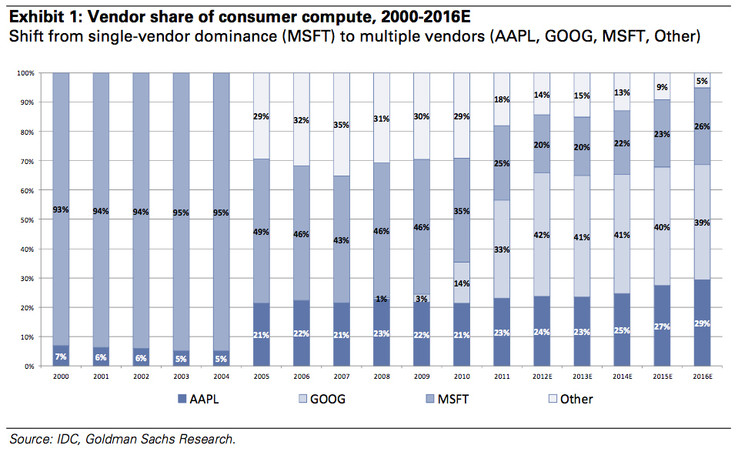 Den Stein hatte wohl die US-Tageszeitung Seattle Times ins Rollen gebracht, als sie die umstrittenen Zahlen der Investment-Bank Goldman Sachs veröffentlicht hat. Laut diesen Zahlen sei der Anteil der Microsoft-Betriebssysteme von 97 Prozent im Jahr 2000 auf 20 Prozent im Jahr 2012 geschrumpft. Apple komme auf 24 Prozent und Google mit Android auf inzwischen 42 Prozent.