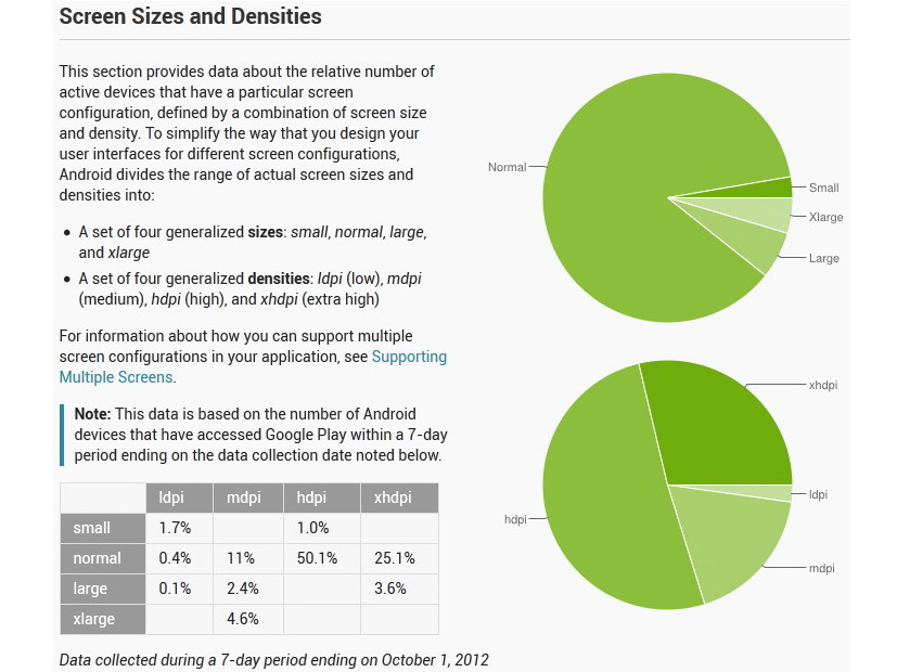 Hinsichtlich der Displaygrößen hält der Trend zu höher auflösenden Displays an. Mobiltelefone mit High-Density-LCDs (hdpi, ~240 dpi) verlieren zwar zum Vormonat (51,9 Prozent) erneut leicht auf 50,1 Prozent. Der Anteil der "xhdpi"-Geräte (bspw. 640 x 960 Pixel) nimmt dafür von 22,3 Prozent auf 25,1 Prozent zu. 7-Zoll-Tablets mit Medium-Density-Panels (mdpi, ~160 dpi) erreichen in Statistik bis 1. Oktober 2,4 Prozent. Mobile Endgeräte mit "mdpi"-Displays, wie das Google Nexus 7 Tablet (1.280 x 800 Pixel) verlieren 0,1 Prozent und landen bei 4,6 Prozent.