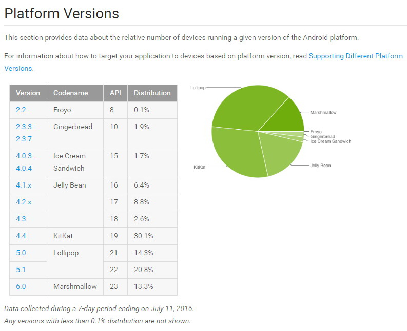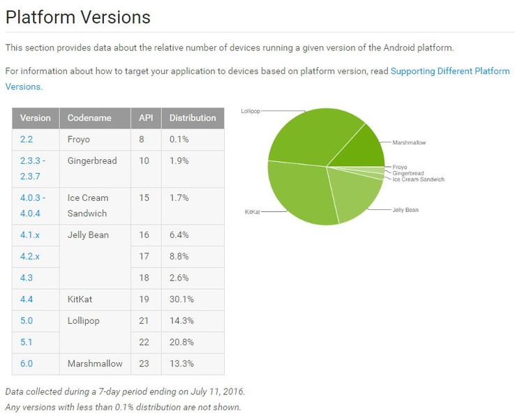 Der Anteil von Android 4.4 KitKat ist auf Mobilgeräten, die den Google Play Store über die App besucht haben, von 31,6 Prozent im Juni auf aktuell 30,1 % im Juli 2016 zurückgegangen. Android 4.1.x bis 4.3 Jelly Bean machten zusammen 17,8 Prozent aus. Im Vormonat Juni waren es noch 18,9 Prozent. Android 4.0.3 bis 4.0.4 Ice Cream Sandwich kam bei den Juli-Abrufzahlen auf 1,7 Prozent (Juni 2016: 1,9 %). Für Android 2.3.3 bis 2.3.7 Gingerbread weist das Dashboard noch 1,9 Prozent (Juni 2016: 2,0 %) aus. Android 2.2 Froyo bleibt bei 0,1 Prozent.