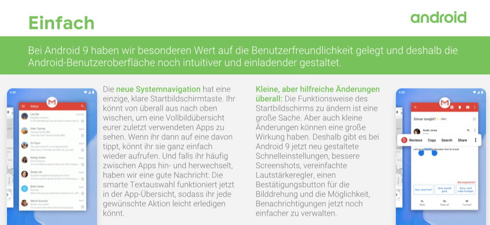 Darüber hinaus bietet Android 9 Pie eine neue Systemnavigation mit einer einzigen Startbildschirmtaste sowie eine Reihe neuer Features wie neu gestaltete Schnelleinstellungen, vereinfachte Lautstärkeregler und Screenshots, einen Bestätigungsbutton zum Drehen des Displayinhalts und eine einfachere Verwaltung von Benachrichtigungen.