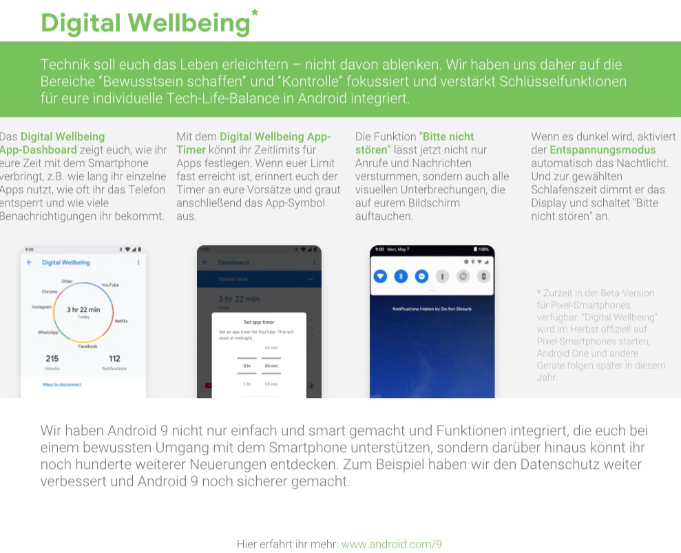 Was in Android 9 Pie noch komplett fehlt, ist der Bereich "Digital Wellbeing". Die angekündigten Neuerungen zur Bekämpfung von Smartphone-Sucht sind aktuell noch nicht in Android 9 Pie zugänglich. Die digitale Sperre gegen übermäßige App-Nutzung ist derzeit lediglich für Pixel-Smartphones in der Beta-Version verfügbar. Ab Herbst sollen Digital Wellbeing dann zunächst die Pixel-Phones erhalten.
