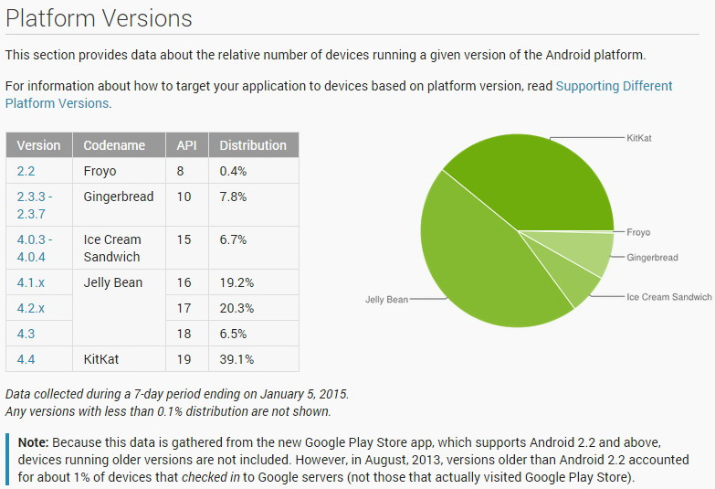 Android 5.0 Lollipop ist Googles neueste Mobile-OS-Version und bisher kaum auf Smartphones und Tablets abseits der Nexus-Geräte, wie dem Nexus 6 und Nexus 9, zu finden. Das macht sich auch in der aktuellsten Auswertung der Zugriffe auf den Google Play App Store im Google Dashboard für den 7-tägigen Erfassungszeitraum bis zum 5. Januar 2015 bemerkbar. Android 5.0 Lollipop ist dort nicht ausgewiesen.
