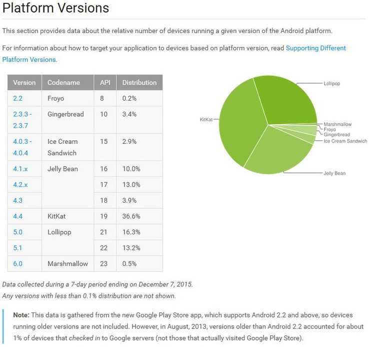 Weiter aufwärts ging es hingegen für Android 5.0 und Android 5.1 Lollipop. Zusammen waren die beiden Android-Versionen für 29,5 Prozent aller Zugriffe auf den Google Play Store verantwortlich (Nov. 2015: 25,6 Prozent). Das Android Dashboard weist für Android 5.0 in der aktuellsten Auswertung 16,3 Prozent (November 2015: 15,5 %) und für Android 5.1 statt 10,1 Prozent jetzt 13,2 Prozent aus. Der Anteil von Android 4.4 KitKat sank weiter, von 37,8 auf 36,6 Prozentpunkte ab.