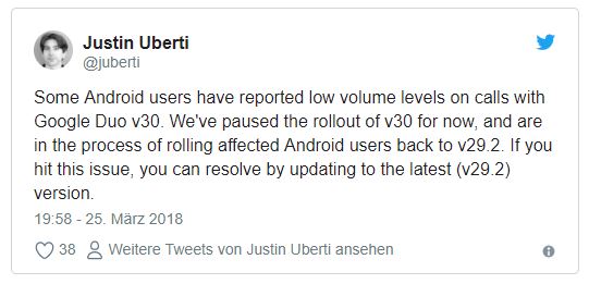 Justin Uberti, seines Zeichens "lead engineer of Google Duo" hat sich auf seinem Twitter-Account zu dem aktuellen Bug in der Version V 30 geäußert. Der Bug wurde somit auch offiziell seitens Google bestätigt. Die Version V 30 wurde im Google-Playstore durch die vorherige Version V 29.2 ersetzt. Das Update soll im Laufe dieser Woche wieder ausgerollt werden. Wann genau hat Google noch nicht kommentiert, auch nicht ob es dann eine gefixte V 30 oder schon die Version V 31 sein wird. Die Duo-App wurde am 16. August 2016 mit der Version V 1 offiziell in den USA veröffentlicht. In knapp 20 Monaten wurden also über 30 Versionen des Messengers veröffentlicht (ohne die Zwischenupdates mitzurechnen). Allzu lange wird das Update daher wohl nicht auf sich warten lassen. Diejenigen unter euch, die Googles Video-Messenger benutzen und diesen Fehler bei sich festgestellt haben, haben die Möglichkeit über den Playstore ein Downgrade des Messengers zu fahren.