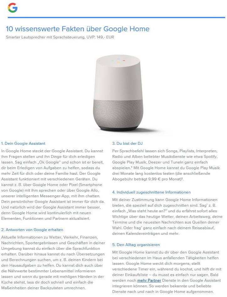 Laut der offiziellen Produktmeldung von Google Deutschland wird Google Home hierzulande für 150 Euro angeboten. Erhältlich ist Google Home gemäß dem Internetriesen dann mit deutscher Sprachunterstützung bei Conrad, Cyberport, EP, MediaMarkt, Medimax, mobilcom-debitel, Otto, Saturn, Tink und ebenfalls online direkt im Google Store.
