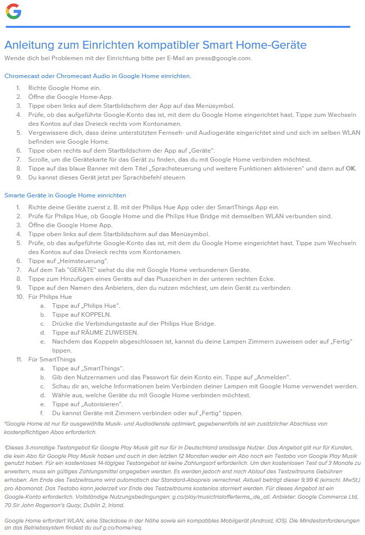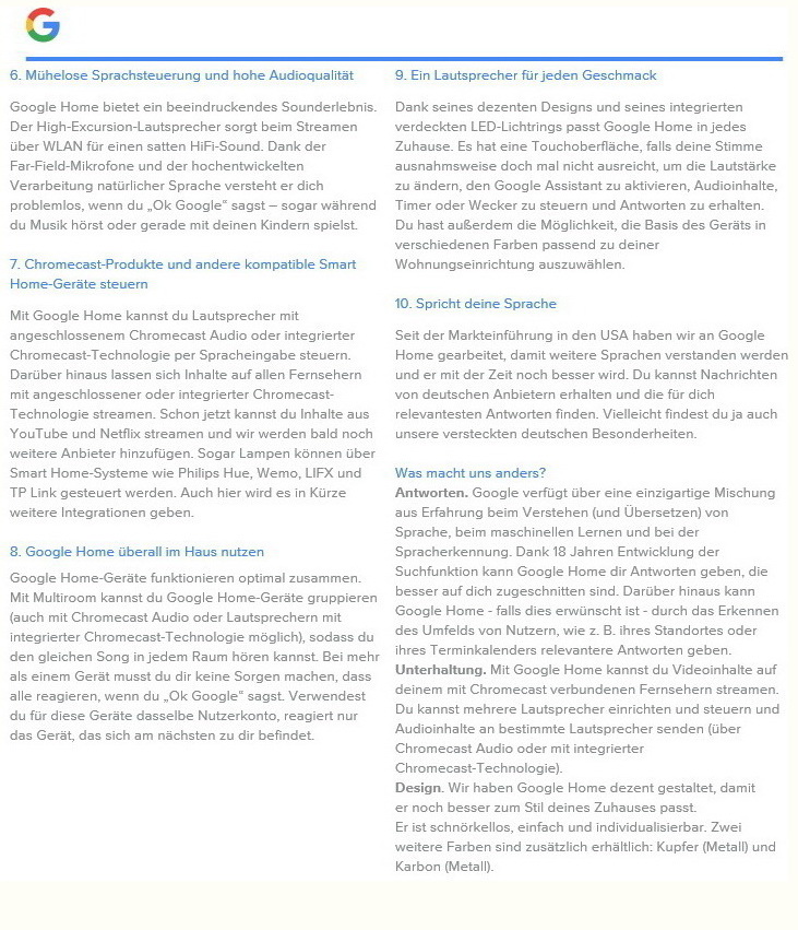 Wie der Amazon Echo und Echo dot verfügt auch Google Home über viele Steuerfunktionen inklusive der Möglichkeit zur Smart-Home-Steuerung. Der Lautsprecher mit Sprachassistent misst 96,4 Millimetern im Durchmesser und kommt auf eine Höhe von 142,8 Millimeter. Das Gewicht beziffert Google mit 477 Gramm. Unterstützt wird Dual-Band WLAN 802.11b/g/n/ac (2,4 GHz und 5 GHz), bei den OS' Android 4.2 oder höher sowie iOS 8.0 oder höher.