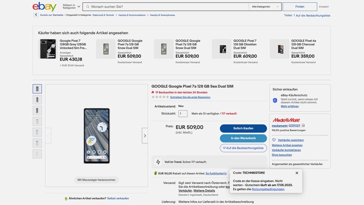 Bei Kauf in einer Filiale werden die 100 Euro direkt vom Kaufpreis des Pixel 7a abgezogen, bei Kauf im Onlineshop müssen sich Kunden nachträglich auf der Aktionsseite registrieren, um ein Cashback zu erhalten. Wer kein passendes Altgerät zum Eintausch besitzt, der kann dennoch 50 Euro auf den Listenpreis sparen, und zwar im offiziellen ebay-Shop von MediaMarkt. Dazu muss beim Checkout lediglich der Gutscheincode "TECHNIKSTORE" angegeben werden.