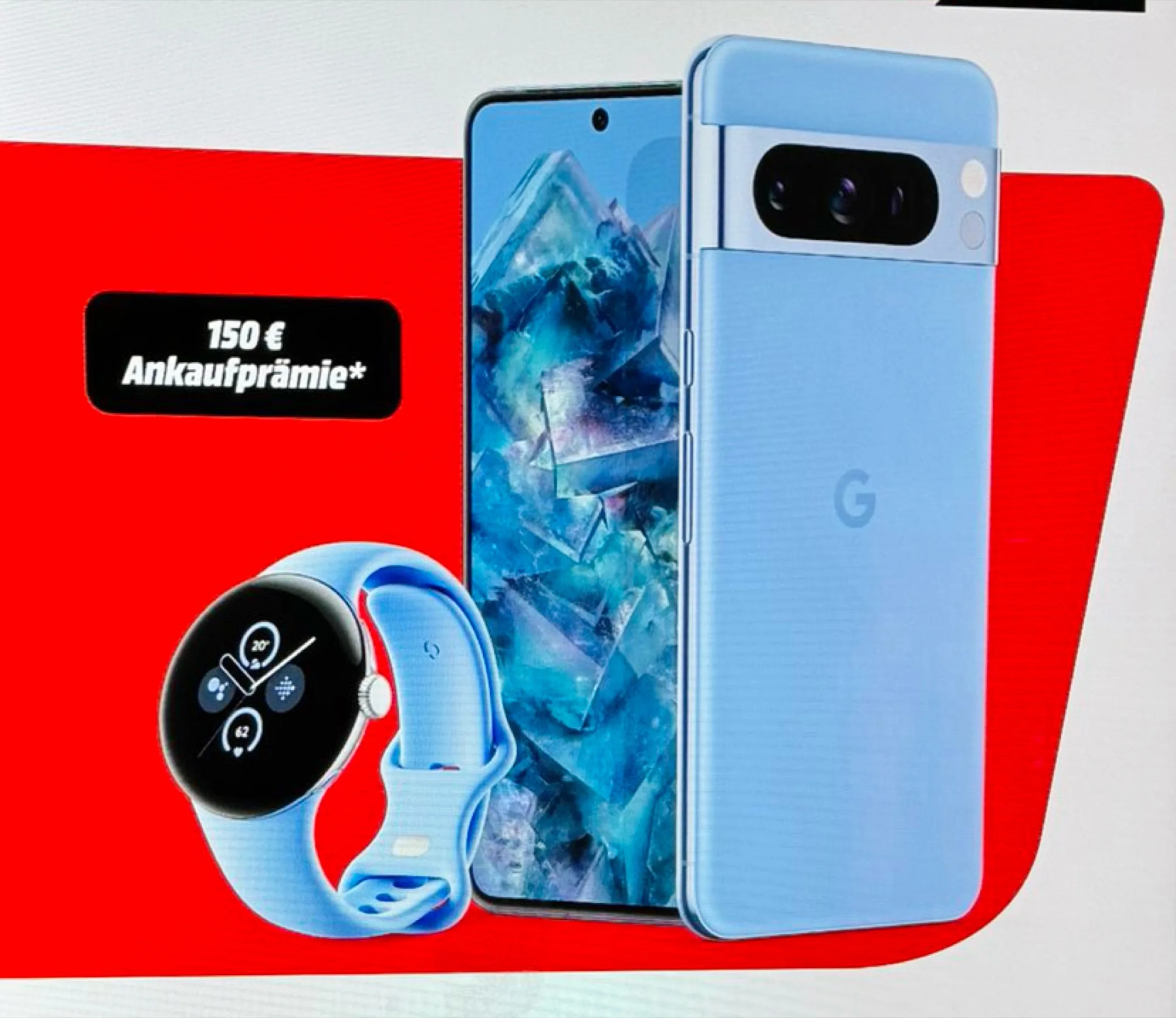 Das passt zu früheren Gerüchten, laut denen dieses Modell weiterhin nur mit 128 GB Speicher ausgestattet ist. Damit steigt der Preis im Vergleich zur unverbindlichen Preisempfehlung des Pixel 7 Pro (ca. 769 Euro auf Amazon) um ganze 200 Euro. Um diese Preiserhöhung weniger drastisch wirken zu lassen, greift Google auf zwei Mittel zurück. Einerseits erhalten frühe Käufer laut des Werbeplakats eine Pixel Watch 2 kostenlos zum Kauf ihres neuen Pixel 8 Pro. Das entspricht Gerüchten zufolge einem Gegenwert von immerhin 399 Euro. Andererseits gewährt MediaMarkt einen Trade-in-Bonus von 150 Euro, zuzüglich zum Ankaufswert des eingetauschten Geräts.