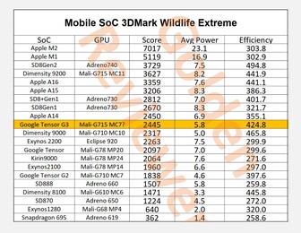 Golden Reviewer hat nun eine Reihe weiterer Benchmark-Ergebnisse veröffentlicht, welche Aufschluss über die Performance und Effizienz des Grafikchips im Tensor G3 geben. In GFXBench Aztec Ruins 1.440p Offscreen kann der Chip nur 37 Bilder pro Sekunde darstellen, und ist damit 22,9 Prozent langsamer als der fast zwei Jahre alte Qualcomm Snapdragon 8 Gen 1, und sogar 46,3 Prozent langsamer als der Snapdragon 8 Gen 2. Dafür fällt der Stromverbrauch mit 4,7 Watt relativ gering aus – die Snapdragon-Chips verbrauchen im selben Benchmark 10,1 Watt bzw. 7,6 Watt. Mit einer Effizienz von 7,9 fps pro Watt liegt der Tensor G3 damit zwischen dem Snapdragon 8 Gen 1 und Gen 2, und immerhin vor dem Apple A16 Bionic und dem MediaTek Dimensity 9200.