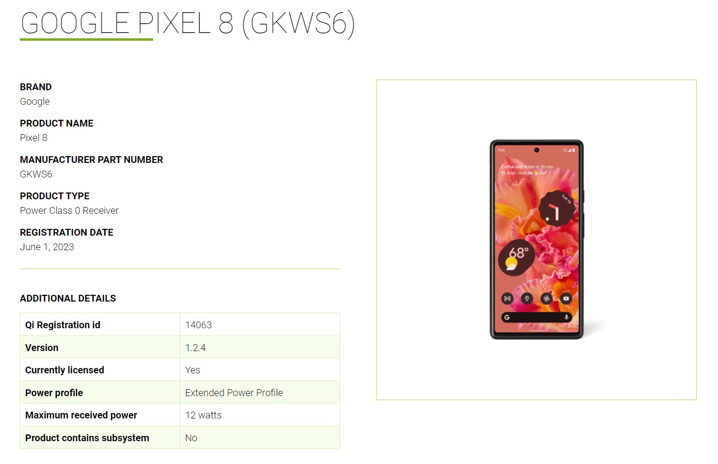 Langsam tauchen Googles im Herbst erwartete Smartphone-Flaggschiffe mit Tensor G3 Chip auch bei den ersten Zertifizierungsbehörden. Aktuell hat etwa 9to5Google das Pixel 8 mit der Modellnummer GKWS6 beim Wireless Power Consortium, kurz WPC entdeckt. Der Screenshot unten zeigt zwar noch ein Bild des Pixel 6, die technischen Angaben und die Modellnummer seien aber korrekt, so die Redakteure.