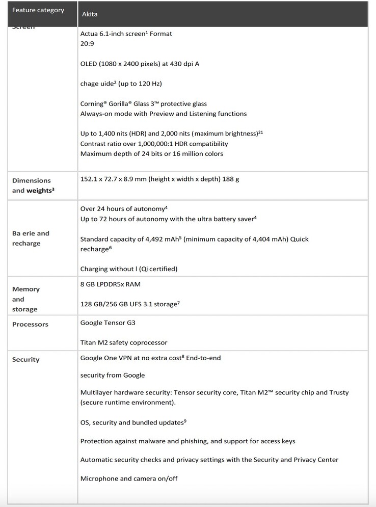 Der wohl am 7. Mai startende Nachfolger des Pixel 7a (hier bei Amazon ab etwa 380 Euro erhältlich) auf Tensor G3 Basis bestätigt sich hiermit als 6,1 Zoll Handy mit einem bis zu 120 Hz schnellen OLED mit 2.400 x 1.080 Pixeln Auflösung sowie maximal 2.000 nits Helligkeit. Das 152,1 x 72,7 x 8,9 mm Smartphone wiegt 188 Gramm und besteht aus einem nach IP67 wasser- und staubdichtem Aluminium-Rahmen mit Gorilla Glas 3. In punkto Funkfrequenzen wird ein breites Spektrum an 4G- und 5G-Bändern unterstützt, auch eine eSIM ist mit an Bord.