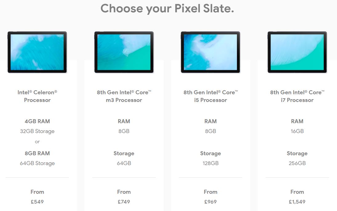 Es ist also kein Pixelbook 2 sondern das Pixel Slate geworden, das bereits am Wochenende geleakt ist. Das Chrome OS-Tablet mit optionalem Stift und Folio-Tastatur/Cover besitzt ein 12,3 Zoll LC-Display mit 3.000 x 2.000 Pixel Auflösung und frontseitigen Stereolautsprechern. Intern arbeitet entweder ein Intel Celeron, ein Intel Core M3-Prozessor oder Intels Core i5- oder Core i7-Prozessoren, allesamt aber extra-energiesparende Dual-Cores und nicht etwa Quad-Cores. Je nach integriertem Prozessor gibt es 4, 8 oder 16 GB RAM sowie 32, 64, 128 oder 256 GB integrierten Speicher, eine Speichererweiterung via Micro-SD-Slot ist nicht vorgesehen, zudem muss man sich für mehr Speicher auch für eine der höherpreisigen Varianten entscheiden.