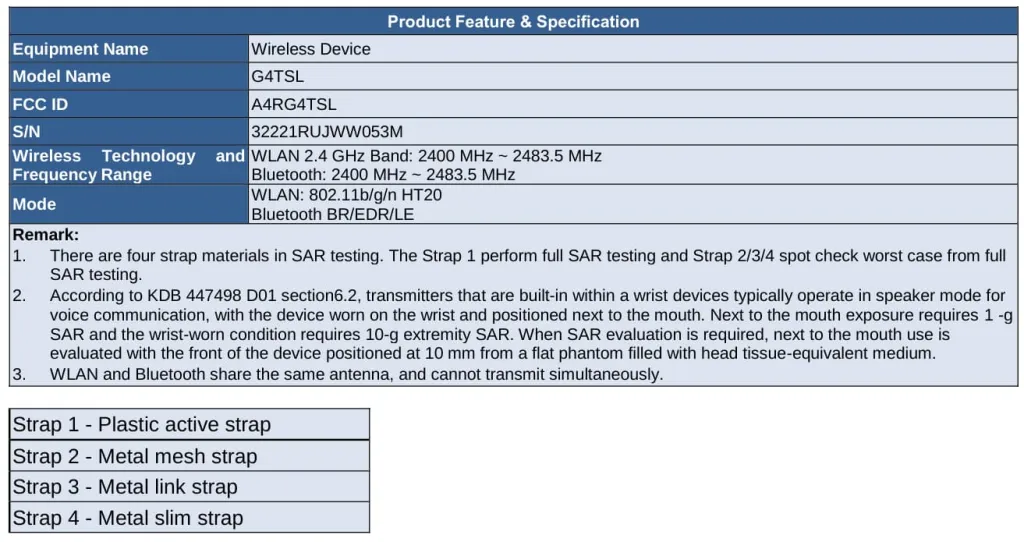 Es ist somit davon auszugehen, dass Google das Angebot an Metallarmbändern im Vergleich zur aktuellen Generation deutlich ausbauen wird. Für die Google Pixel Watch gibt es aktuell nur ein klassisches Kettenarmband aus Metall (Metal link strap). Dazu scheint die zweite Generation mit einem Milanaise-Armband (Metal mesh strap), das für die erste Generation angekündigt, bisher aber nicht erhältlich ist, zu kommen. Zudem listet die Zertifizierung neben einem üblichen Kunststoffarmband (Plastic active strap) für einen sportlichen Look noch ein weiteres und voraussichtlich besonders dünnes Metallarmband (Metal slim strap).