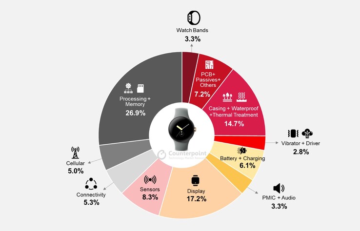 Counterpoint Research hat nun eine "Bill of Materials"-Analyse veröffentlicht, laut der die Pixel Watch in der Produktion 123 US-Dollar kostet, umgerechnet also etwa 115 Euro. Damit ist die Pixel Watch weitaus kostspieliger in der Herstellung als sämtliche Fitbit-Smartwatches. Das liegt laut Counterpoint Research vor allem daran, dass Wear OS 3.5 mehr Leistung erfordert, als das schlanke Fitbit-Betriebssystem, weshalb Google den Samsung Exynos 9110, einen NXP MIMXRT595S Co-Prozessor, 2 GB RAM und 32 GB Flash-Speicher verbaut – 26,9 Prozent oder rund 30,94 Euro gehen alleine auf diese Komponenten zurück.